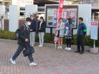 今回は、「あいさつ・声かけ運動」街頭キャンペーンとして、日立駅前・本校正門前・生徒昇降口前・宮田橋交差点信号付近(南側・北側)の 5 か所に分かれ、保護者の皆様と一緒にあいさつとマナーアップの呼びかけを行いました。