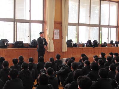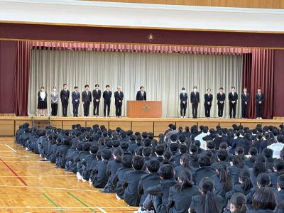 式終了後、中学生は移動し、中学校の集会や部活動顧問の発表が行われました。